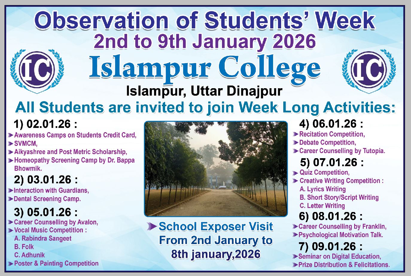 This is to notify that all students of the Islampur College are, hereby, encouraged to take part in the following events to turn the Students’ Observation Week into an enlightening celebration.