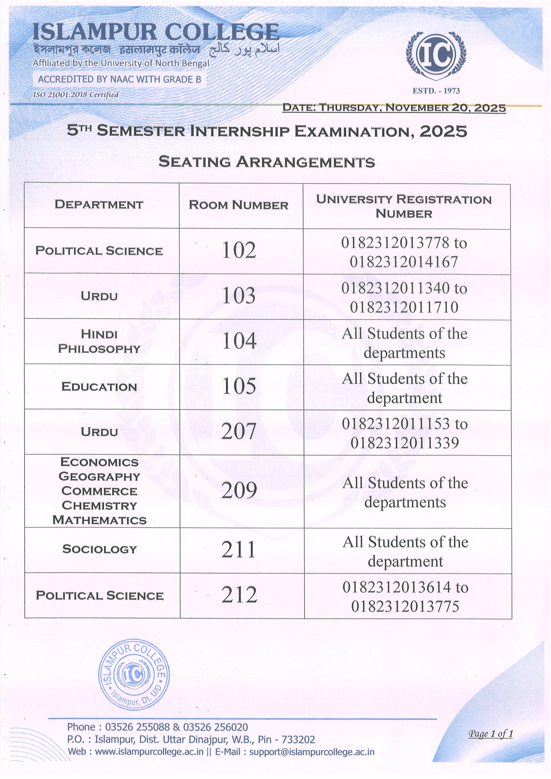 5TH SEMESTER INTERNSHIP EXAMINATION DATE: 21/11/2025 (12.30 PM)