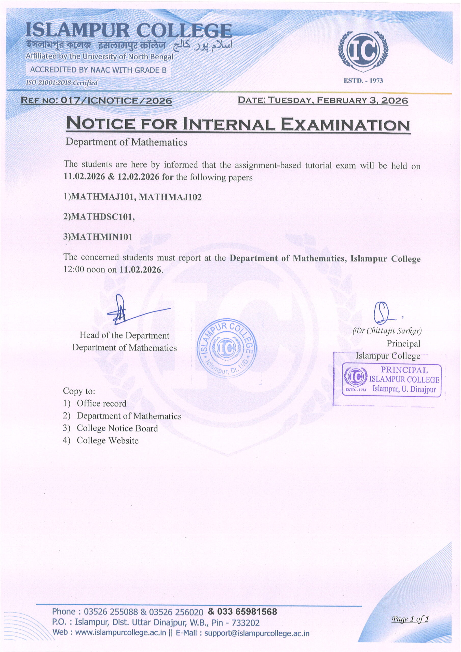 Mathematics Tutorial Exam for 1st Sem – Islampur College